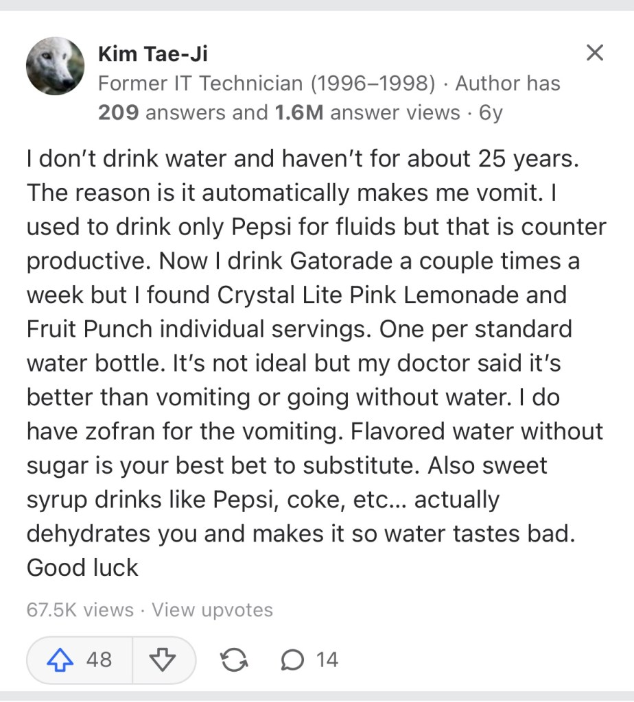 - Claiming to not have drank water for 25 years