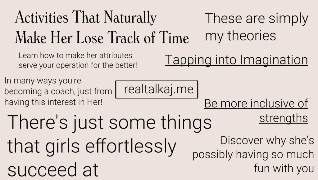 That’s not to say that there’s not other talents she’s a natural at. I’m starting at a general location. You’re gonna have to be more locked in with what makes your girl unique. Women are generally more emotional beings and we as a society tends to value creativity when it’s powered through emotion, but digress here.